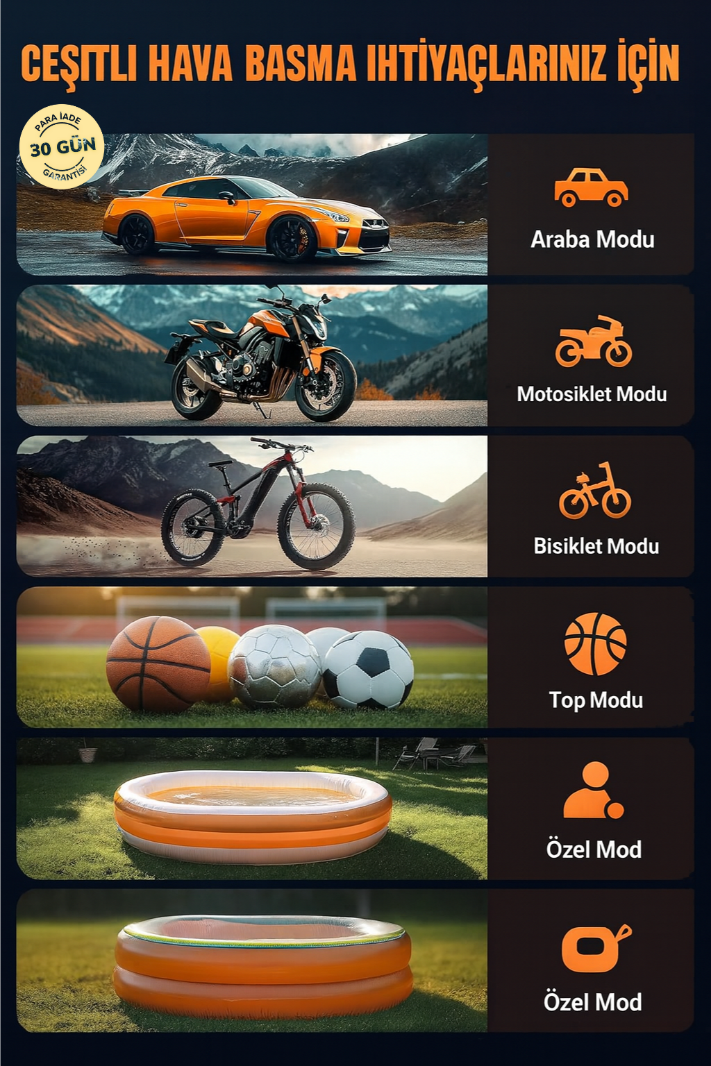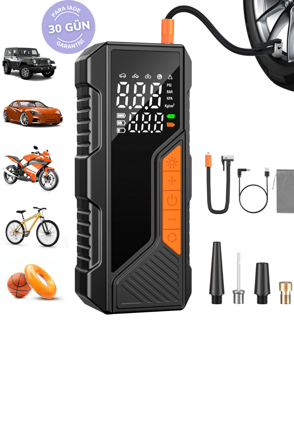 Araba, motosiklet, bisiklet, top ve şişme oyuncaklarda kullanılabilir. Ayrıca özel mod ile istediğiniz basınç değerini manuel ayarlayabilirsiniz.