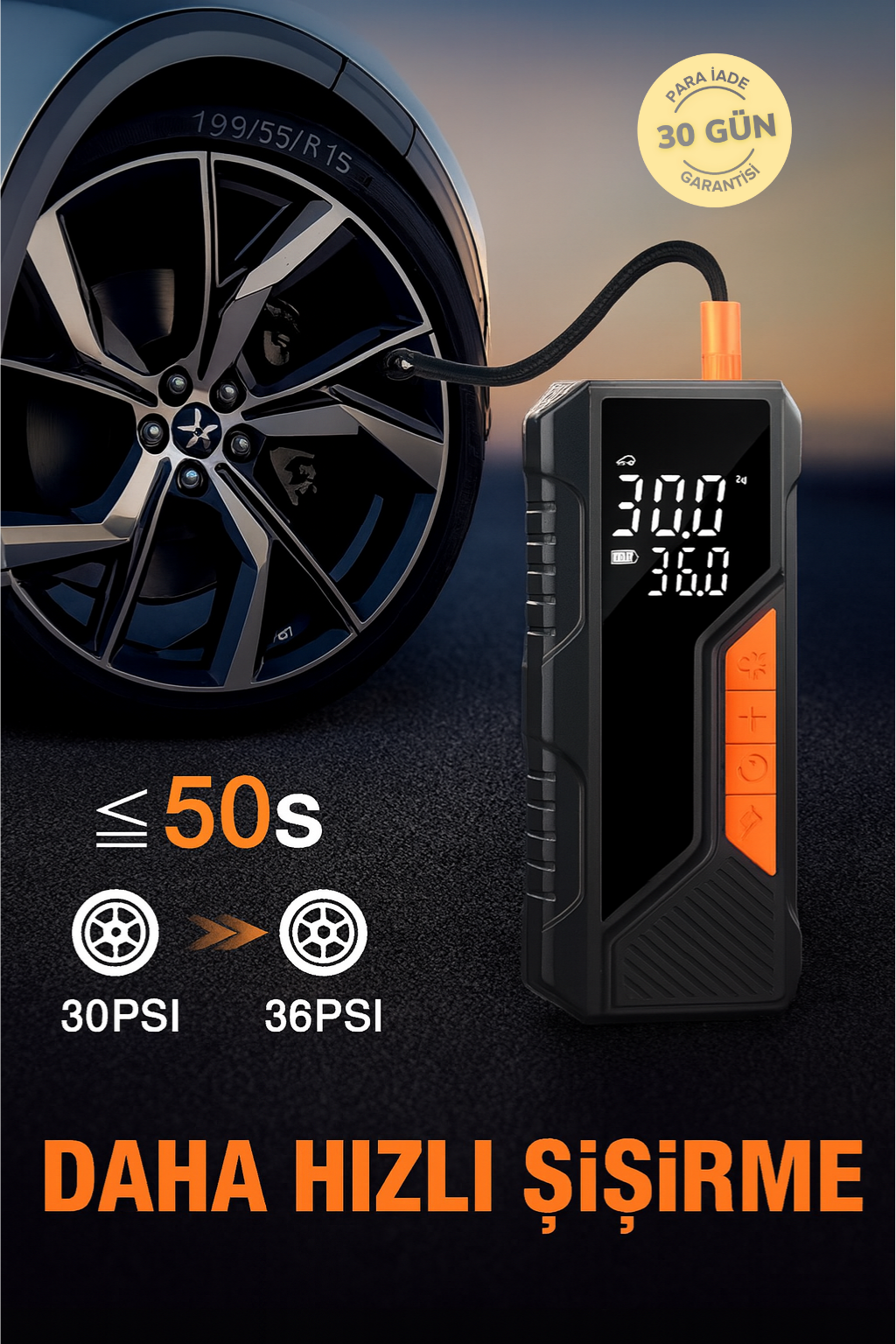 Tam şarj edildiğinde 3-4 adet 195/55/R15 otomobil lastiğini 0’dan 36 PSI’a kadar şişirebilir.